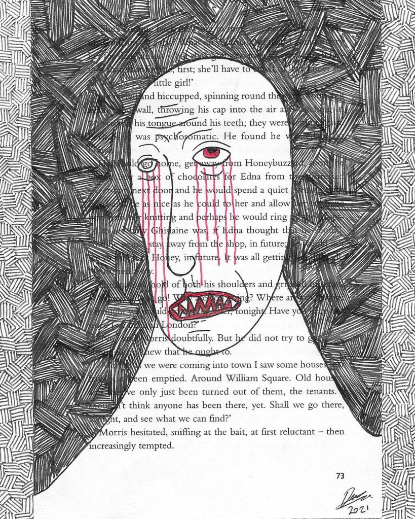 The other day, I decided to experiment by drawing directly onto a paperback book page. I’m really happy with the result, and it got me thinking that I might create a series of such drawings in the near future.