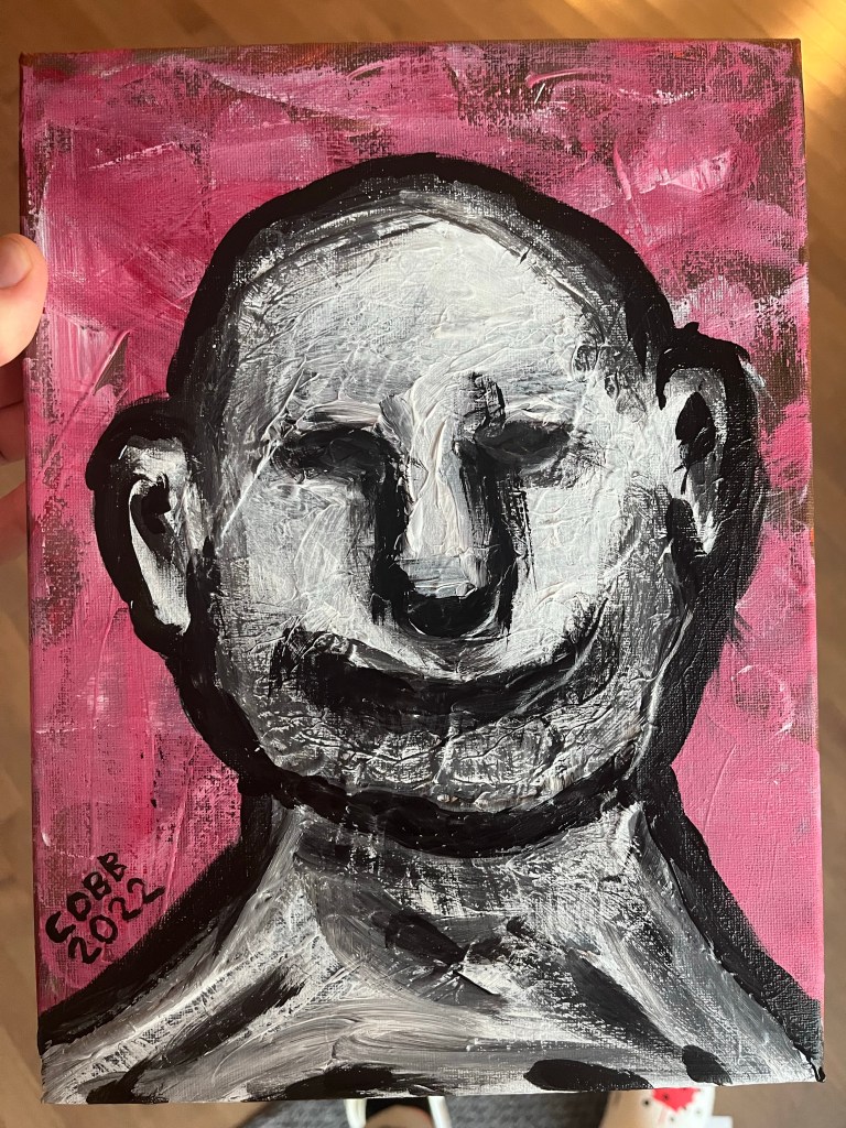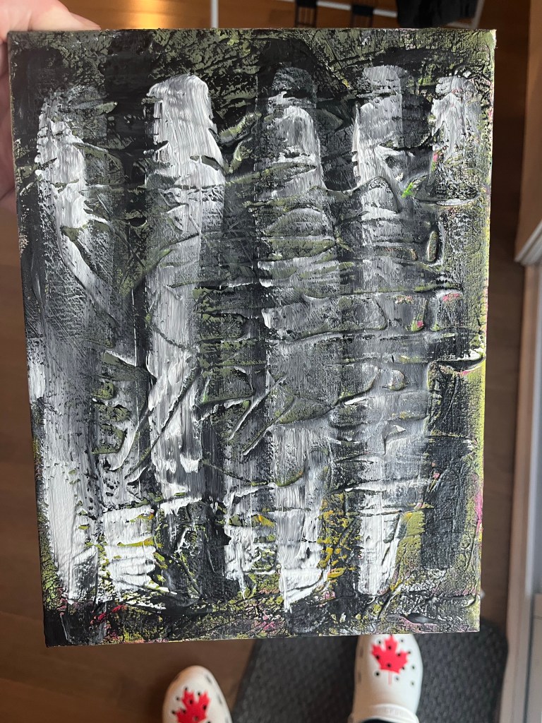 As you can see from this photo, I have produced quite a bit of abstract art as of late. This piece, as of yet untitled, explored a primal, undefinable aspect of my subconscious. That sentence probably sounded like absolute nonsense, but that’s the best way I can describe it. Abstract art is for me an attempt to expel and express unexplainable thoughts and feelings. The thoughts themselves are not constructed of words or images, so why should the art that expresses them?
